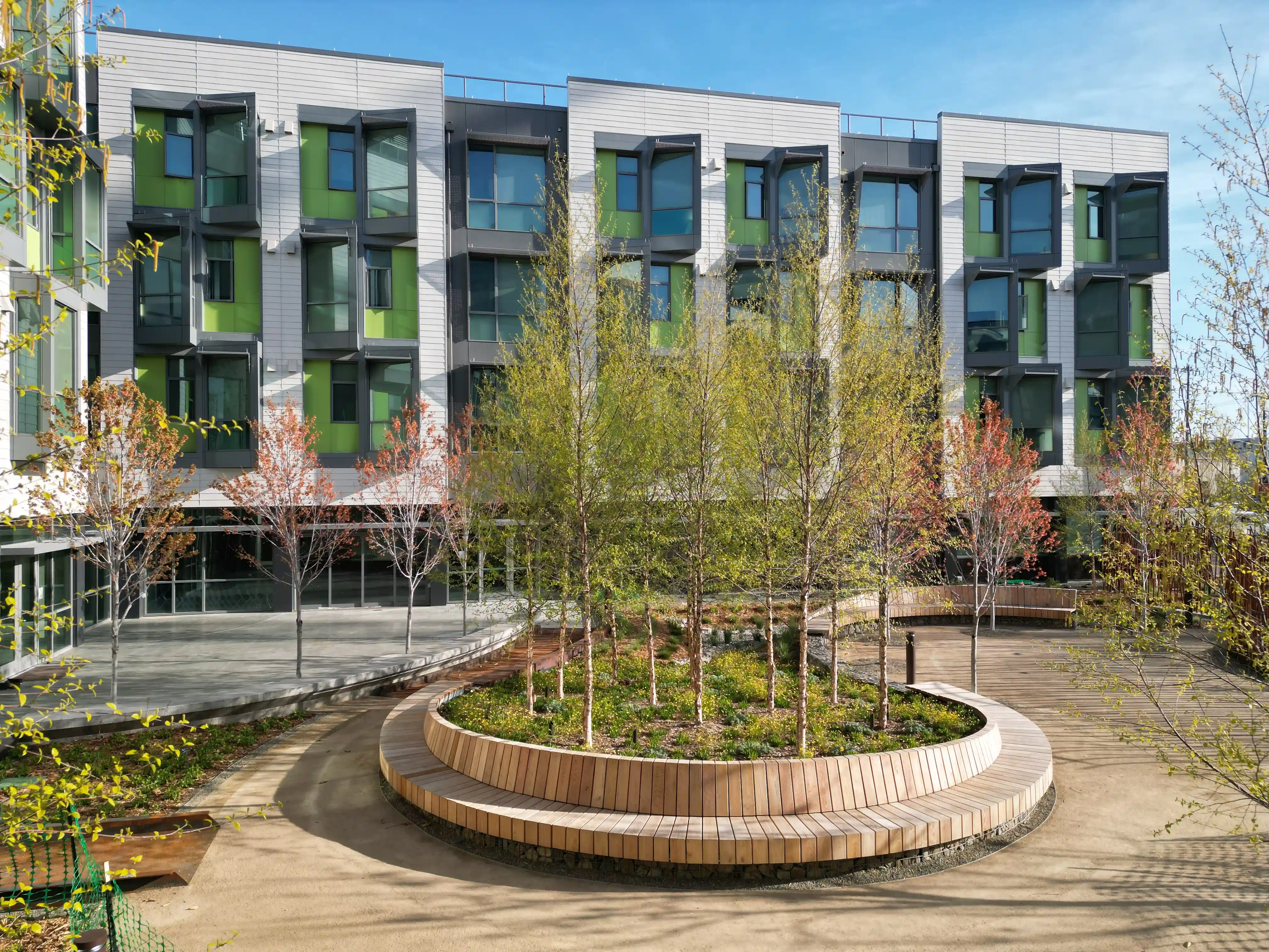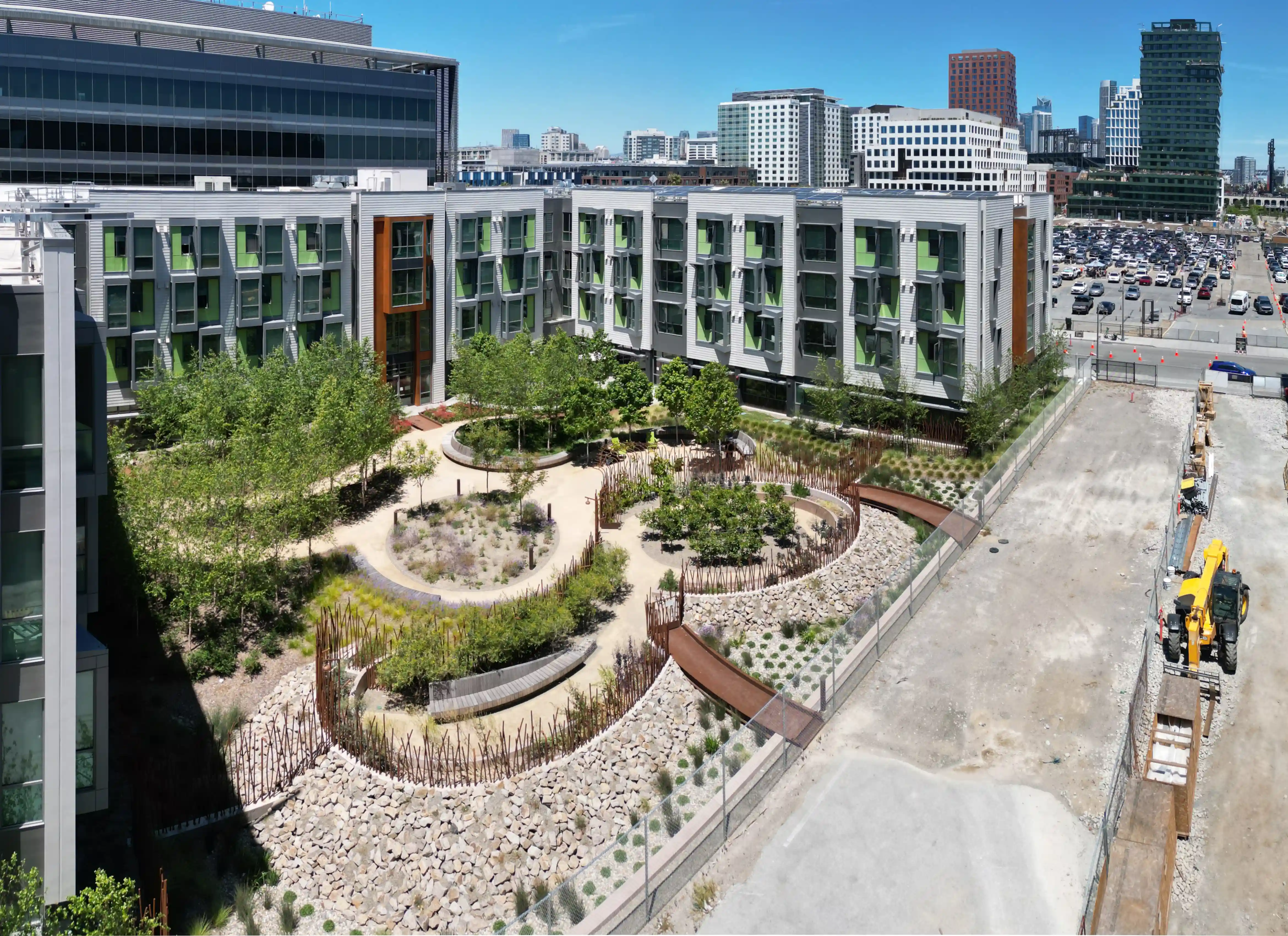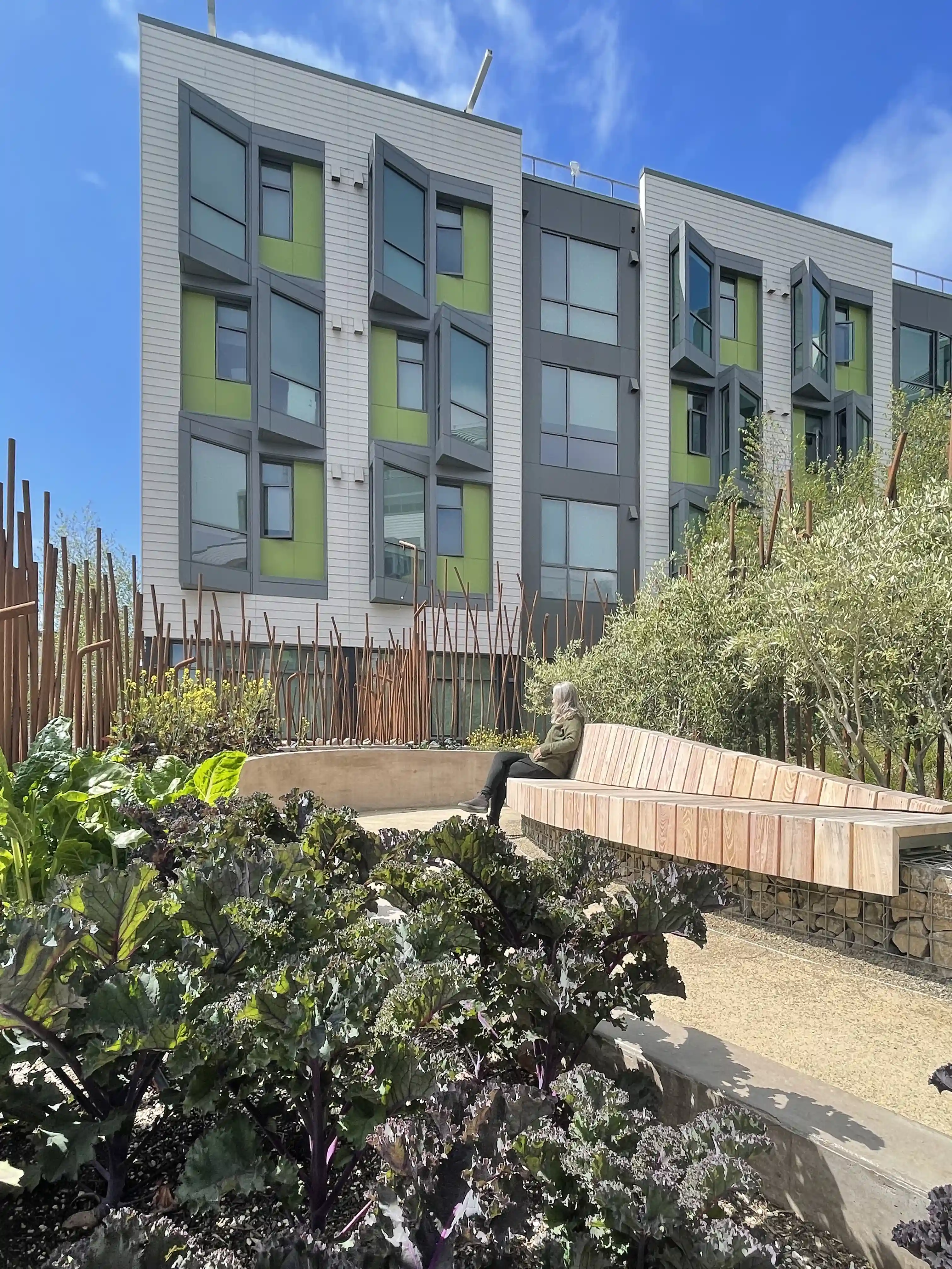 In late 2017, the Office of Community Investment and Infrastructure (OCII), the successor to the San Francisco Redevelopment Agency (SFRA), selected BRIDGE Housing Corporation and HomeRise through a competitive process to develop and operate new permanent supportive housing for formerly homeless individuals on Mission Bay South Block 9. The development came at a critical time in San Francisco’s strategy to address homelessness and strengthen economic recovery in the wake of the pandemic. It represented a citywide collaboration between OCII, HomeRise, BRIDGE Housing, the Department of Homelessness and Supportive Housing, and HealthRight 360, combining resources and expertise to expand the City’s permanent supportive housing stock, create jobs, and invest in sustainable infrastructure. More than just a housing development, the project is built around the idea of stability, health, and connection. Residents benefit from 24-hour reception, indoor and outdoor community spaces, and a range of onsite supportive services that include case management, clinical care, and medical services. At the ground level, a public community garden extends the project into the wider neighborhood, encouraging edible plant cultivation, healthy routines, and opportunities for social connection. The architectural design integrates into Mission Bay’s transformation from an industrial area to a vibrant residential district. Careful attention was given to scale, unit articulation, materials, and colors to create a sense of place that feels both contemporary and welcoming. A central courtyard forms the heart of the project, extending the tidal nature of the bay through bioswales planted with native species to manage stormwater naturally. The courtyard connects to Bridgeview Way through a community garden that offers residents and neighbors a shared green space, bringing nature directly into the urban fabric. Sustainability and resilience were central to the project. The development incorporates high-performance exterior envelopes and windows, enhanced ventilation systems that improve indoor air quality, rooftop solar energy systems with battery backup, and recycled water infrastructure. The ground floor was elevated in anticipation of sea-level rise, and engineered walks and ramps are designed to maintain accessibility even in the event of future ground subsidence. Every element of the design contributes to a healthier living environment and a more resilient building that can serve residents for generations. Amenities were designed to support both individual stability and community building. The development offers a resident courtyard with seating areas, fitness trail, dog run, shared laundry facilities, a community lounge, and a demonstration kitchen for group activities. Secure bicycle parking and a large community garden further enhance the sense of shared space, while onsite case management and medical services provide the direct support residents need as they transition into stable housing. Our team was proud to play a role in this transformative project by supplying the lumber used in construction. The choice of durable and responsibly sourced wood reflected the project’s commitment to sustainability and long-term resilience. The lumber we provided contributed not only to the building’s structural integrity, but also to its ability to align with San Francisco’s broader goals for environmentally conscious growth and investment in materials that support both people and the planet. HomeRise at Mission Bay now stands as a landmark development in San Francisco—a place where secure housing, supportive services, and sustainable design come together. It is more than a building; it is a foundation for stability, dignity, and community. By providing the lumber that helped bring it to life, we are proud to have contributed to a project that changes lives, strengthens neighborhoods, and demonstrates what is possible when social responsibility and resilient design go hand in hand.